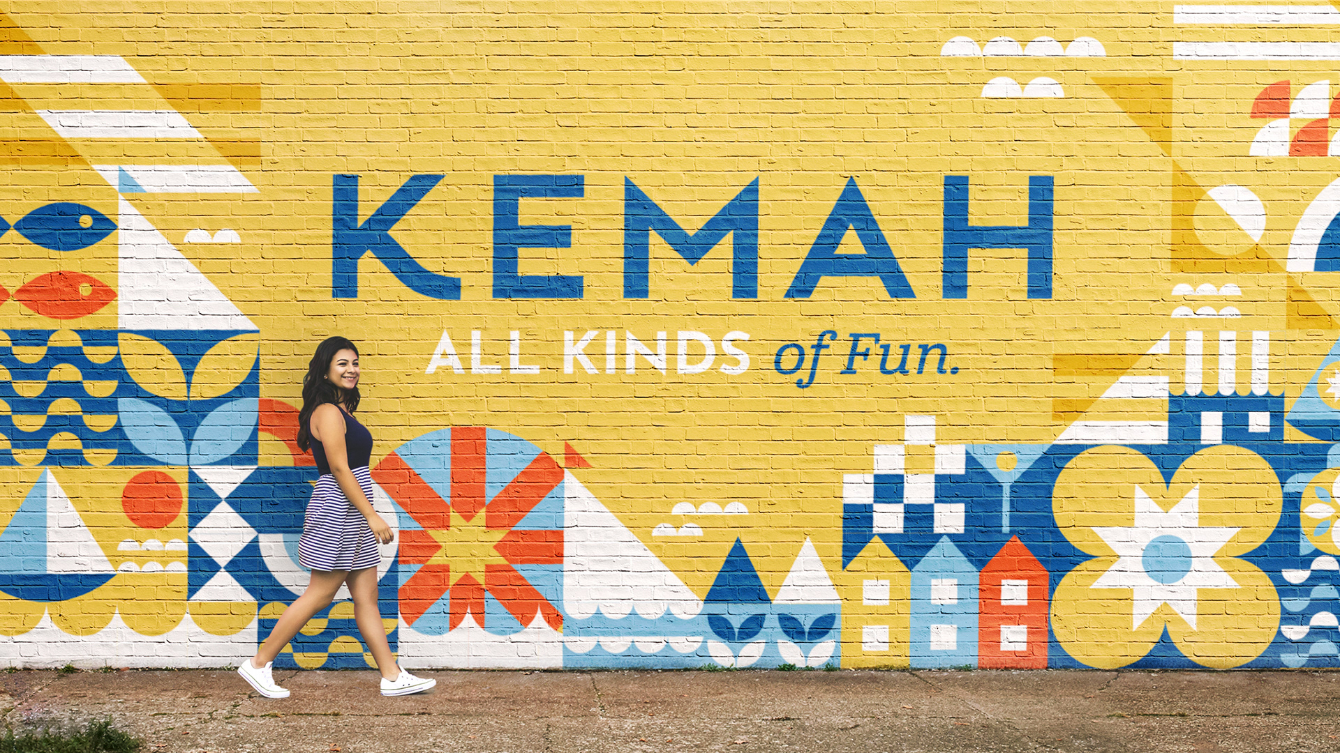 Kemah has been and will forever be connected to the water and the wind. Its boating culture and walkable waterfront, even down to the name Kemah meaning “wind in the face”. Inspired by the international communication system of nautical flags, I developed my own versions. Each one capturing an idea or activity that makes Kemah unique and communicates it in an instant much like the nautical flags do for passing boats.