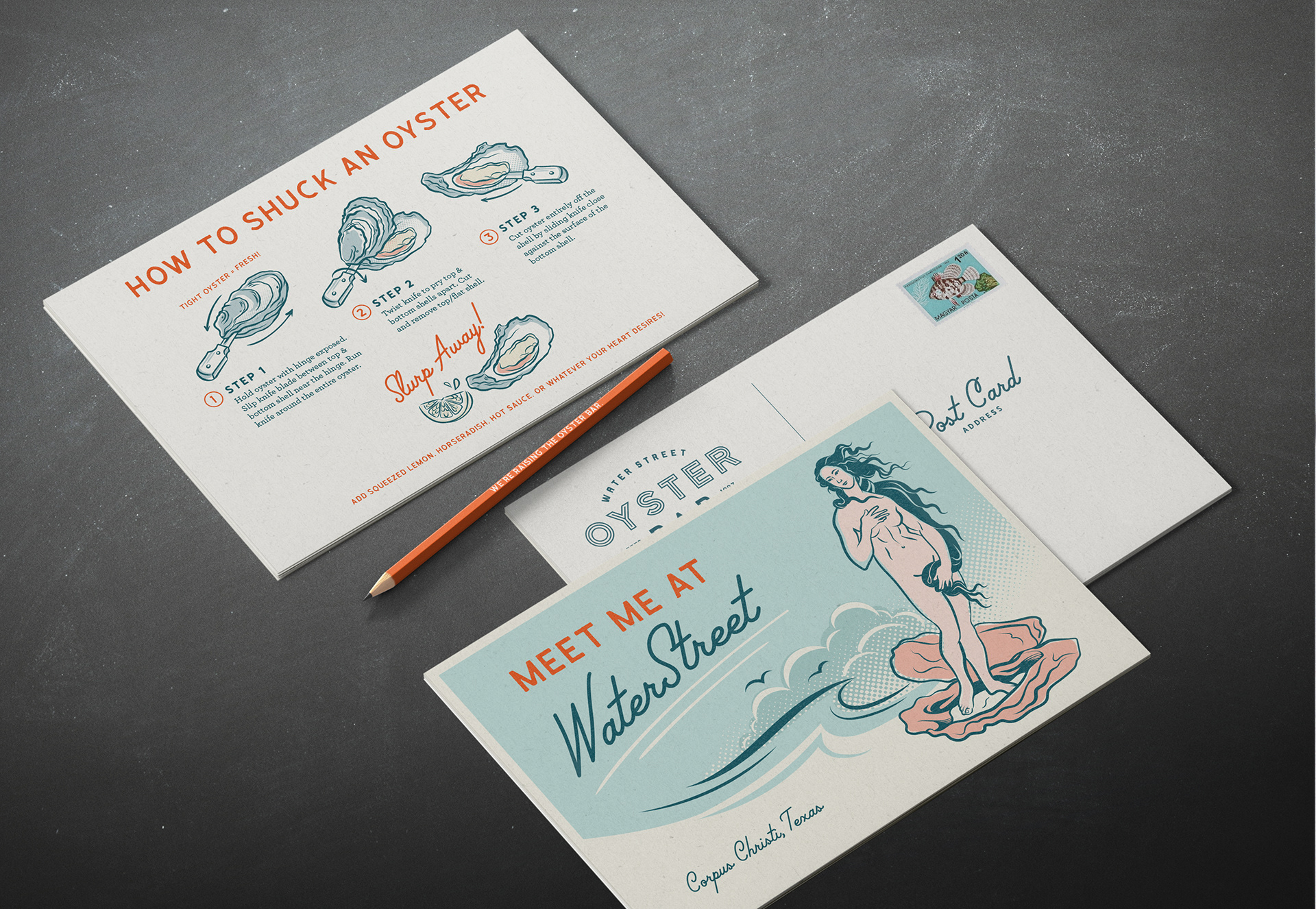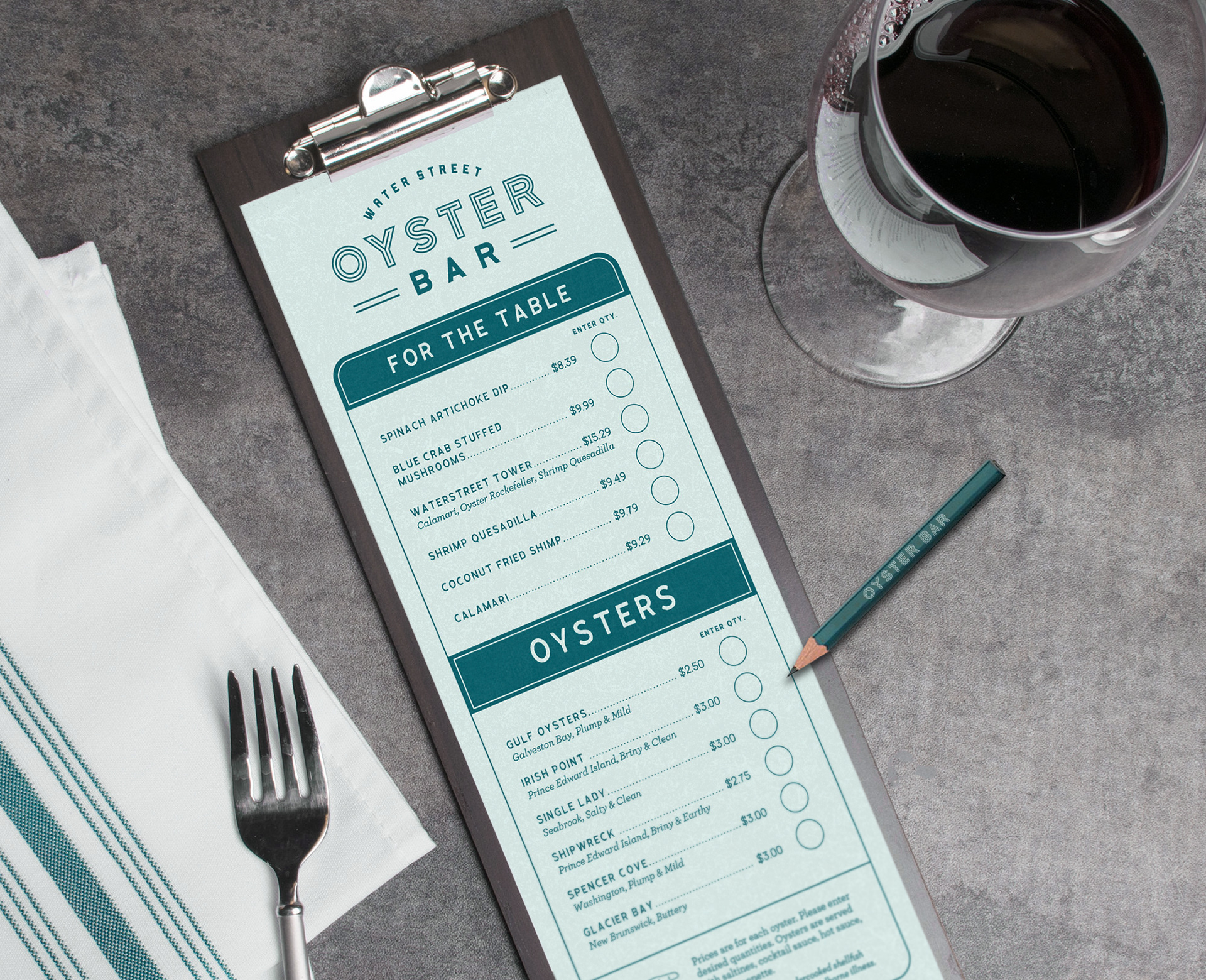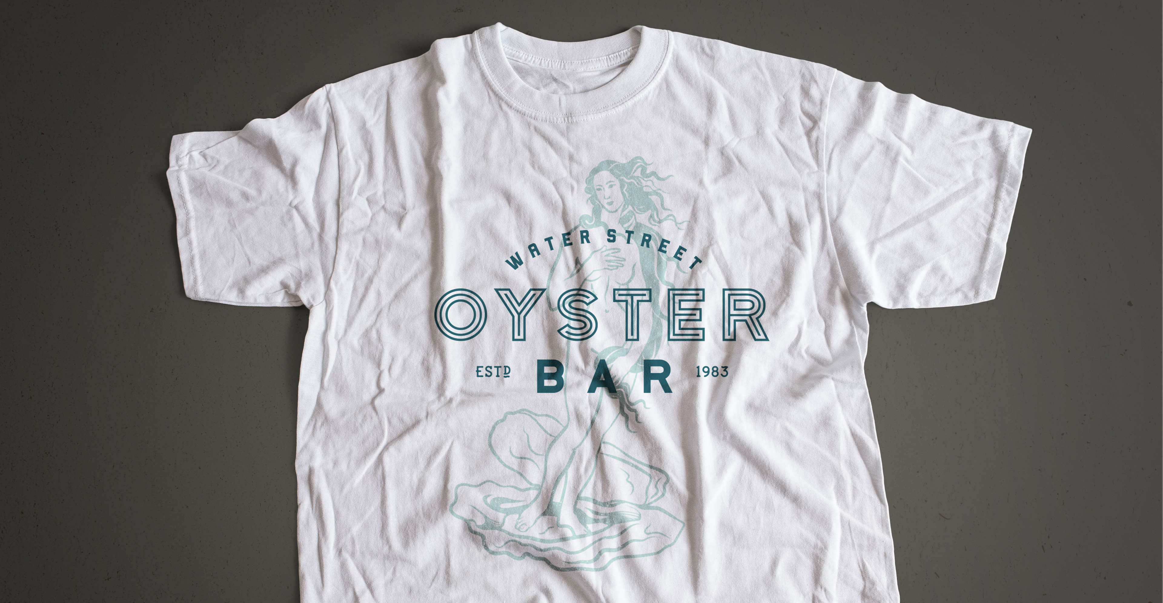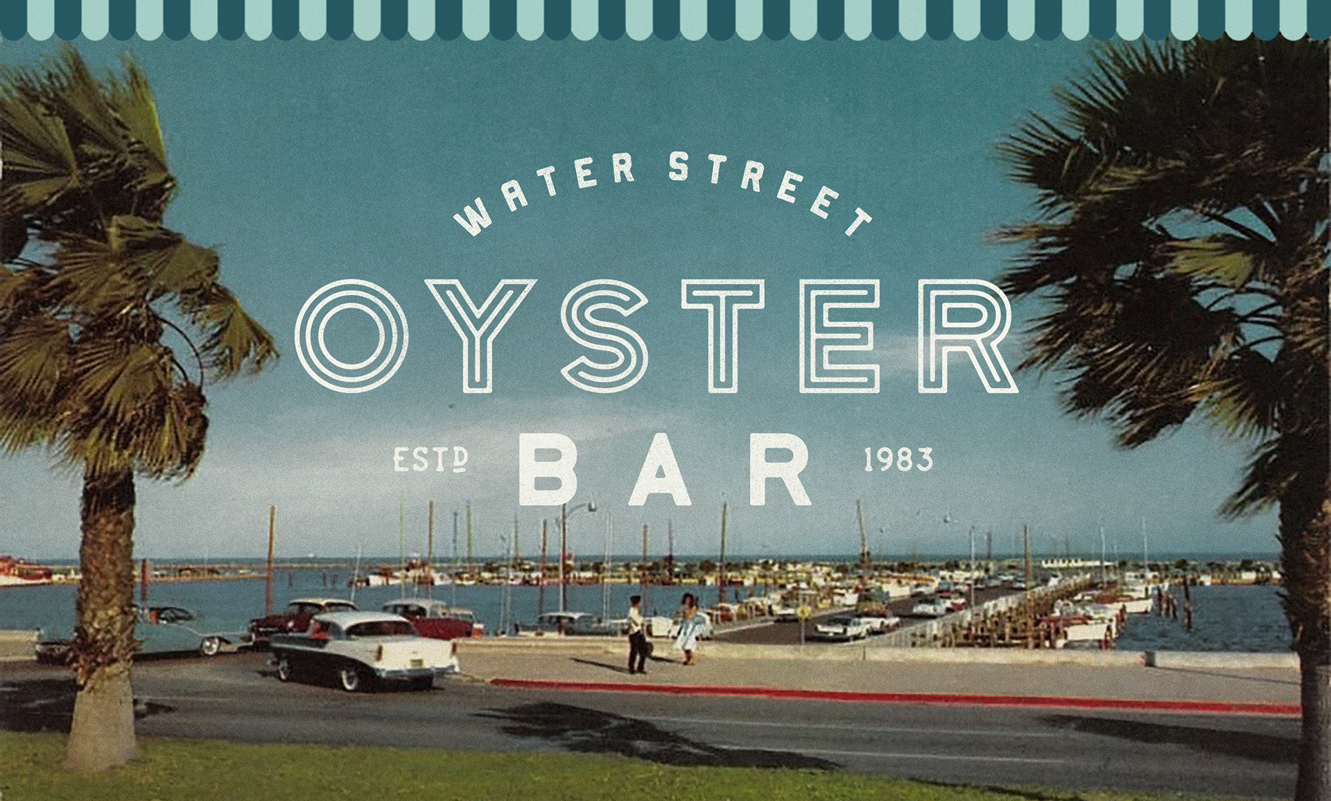 Identity and logo for the Water Street Oyster Bar in Corpus Christi Texas. Since 1983, the Oyster Bar has been a local favorite for fresh seafood in a comfortable, classic setting. Family-owned and food-focused, this seafood icon was built from a historic transmission shop, quickly gaining a reputation for quality ingredients, great service and of course, fresh oysters. With a nod to the past, the new identity puts a modern spin on this South Texas classic.