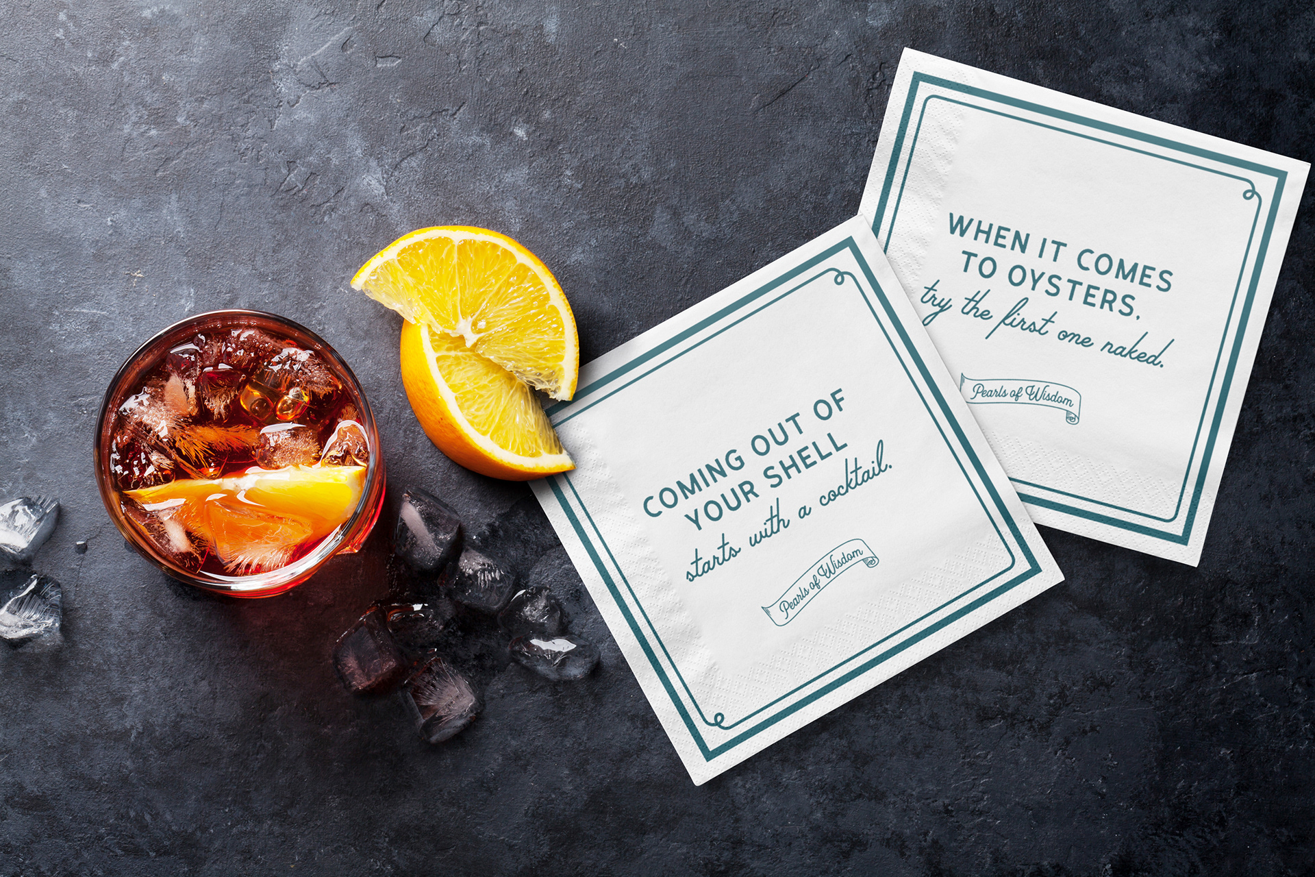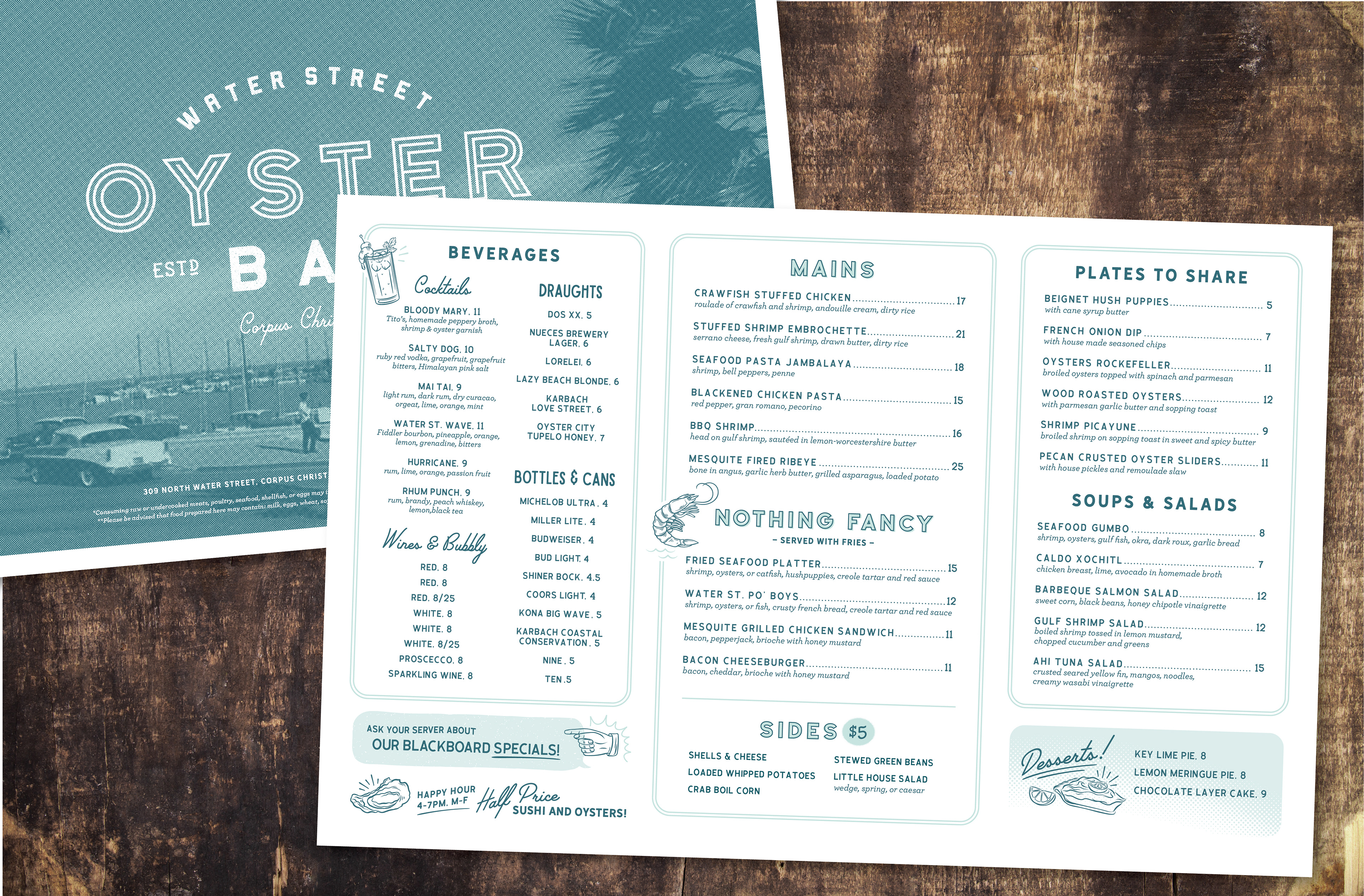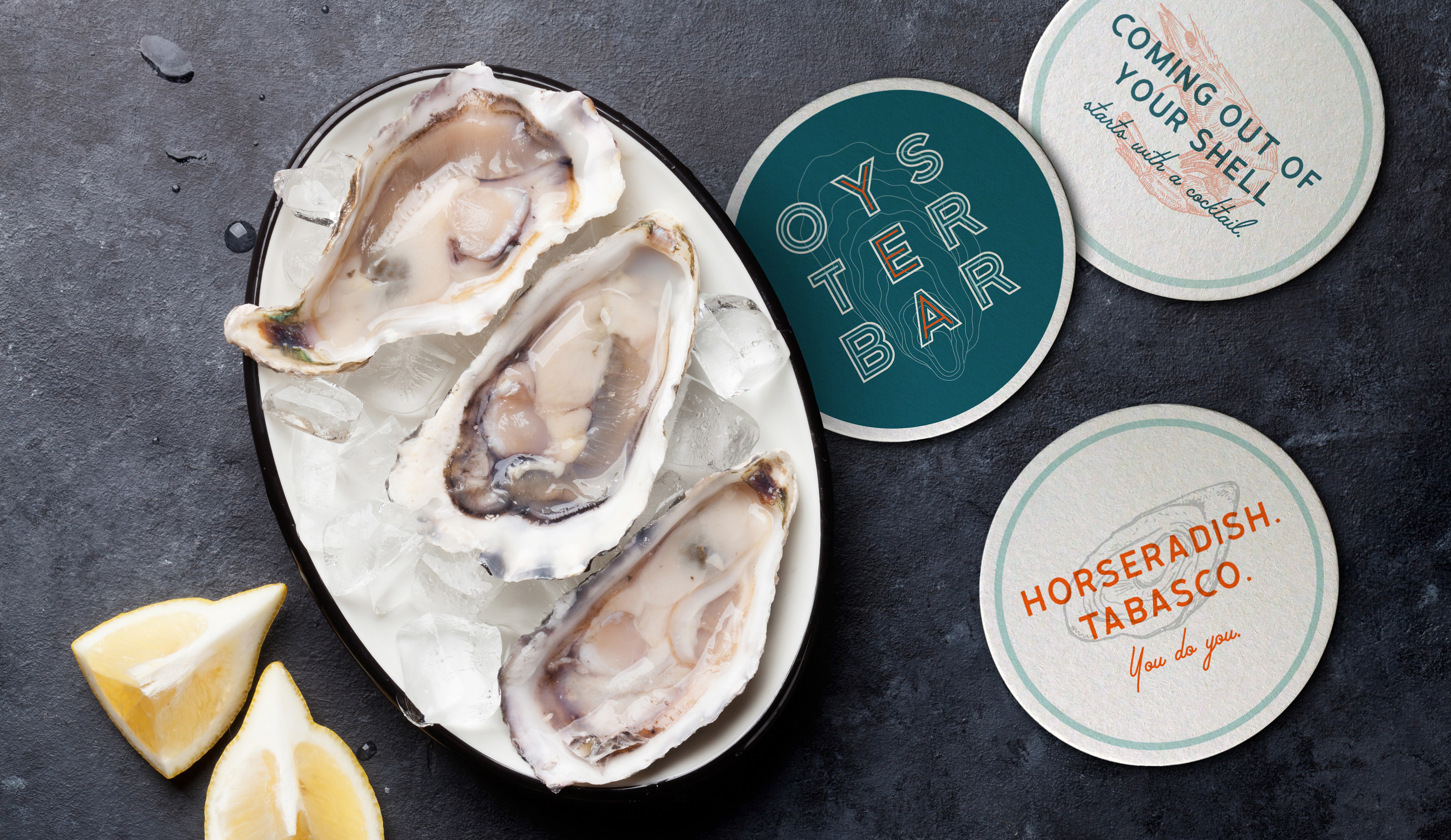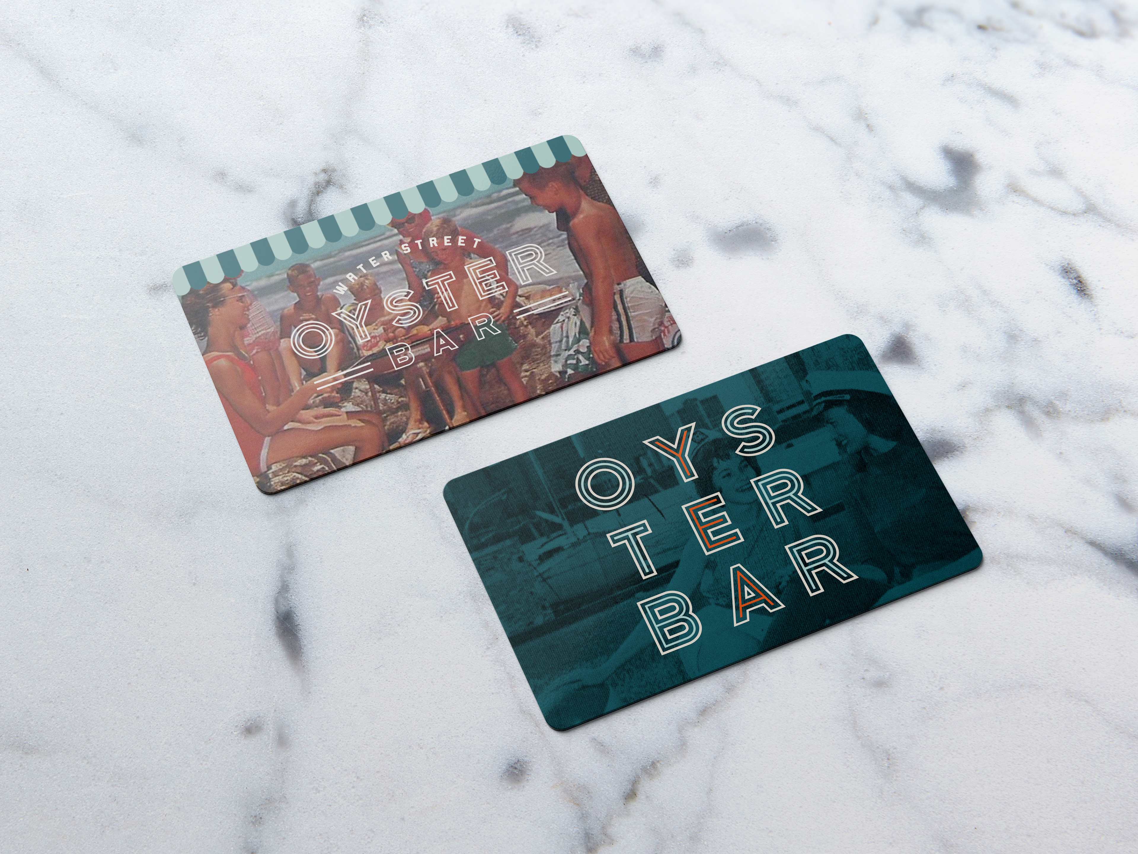 Identity and logo for the Water Street Oyster Bar in Corpus Christi Texas. Since 1983, the Oyster Bar has been a local favorite for fresh seafood in a comfortable, classic setting. Family-owned and food-focused, this seafood icon was built from a historic transmission shop, quickly gaining a reputation for quality ingredients, great service and of course, fresh oysters. With a nod to the past, the new identity puts a modern spin on this South Texas classic.
